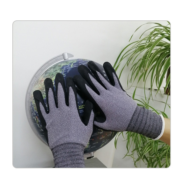 | Pruduct Name | Seamless Knited Grey Nylon + Spandex 15 Gauge Work Glove with Sandy Nitrile Coated on Palm & Fingers, Microfinish Dipping |